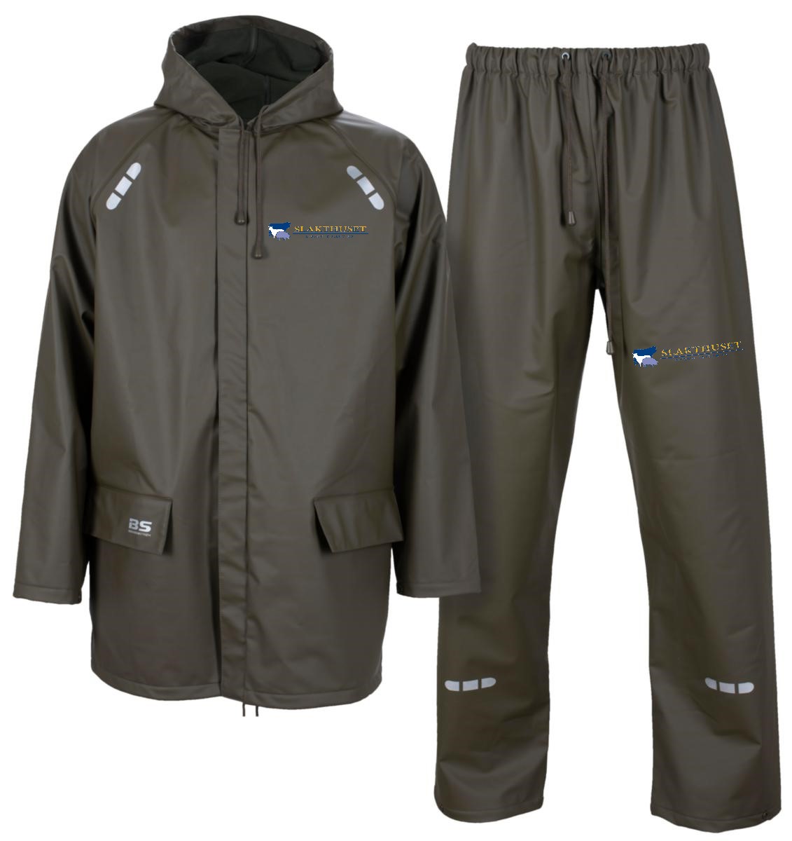 Regnsett bestående av jakke og bukse. Regnjakke: Sveisede sømmer. Glidelås og stormklaff med trykknapper i front. Luftehull skjult av klaff øverst på rygg. Børstet innside. Hette med strammesnor. Forlommer, begge med klaff. Trykknappregulering i ermeavslutning. Strammesnor i linning. Nakkehempe. Regnbukse: Sveisede sømmer. Strikk og strammesnor i linning. Trykknappregulering i ben. Hempe innvendig bak i linning. Refleksdetaljer på jakke og bukse.